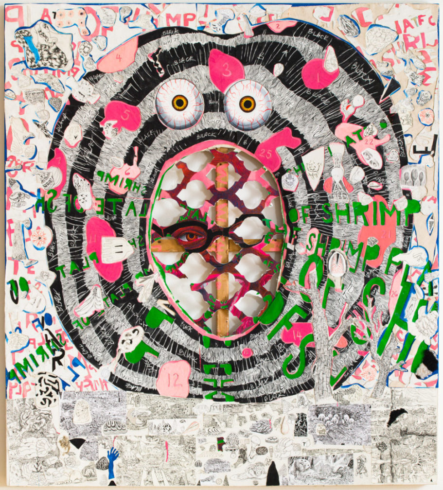 These and other paintings are united by a shared grid pattern that had haunted the film and that has now become entwined with the paintings. The pattern itself comes from the linoleum quatrefoil floor tiling in my grandmother’s house and the many memories I have of lying on that floor trying to impress my grandmother with the drawings I was making. It seems the pattern has grown to become an integral structuring element in my recent works, and it simultaneously serves as a barrier, grid, compartmental device, and familial foundation. Since I see my process as additive and do not “retire” any imagery, grids have become an important frame to shape an ever increasing cast of images and icons that inhabit my world.