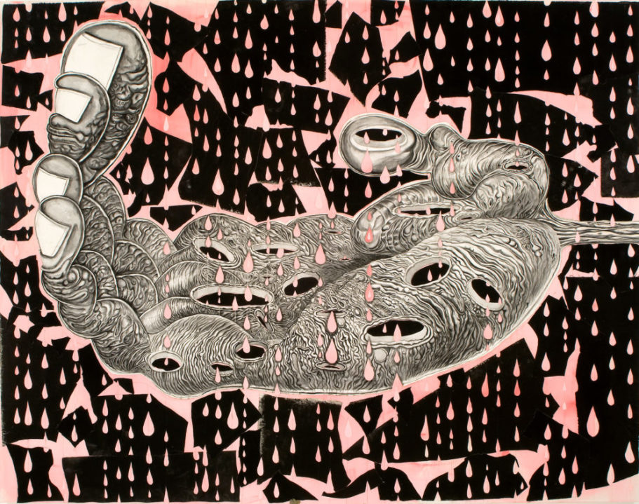 In the past, grids have taken many forms: a system of veins, tree branches, arms, hands, legs, floral arrangements, and even text. They help shape and organize my subjects into bite-sized chunks that accumulate and swirl into increasingly larger narrative fields. Currently, the quatrefoil pattern is pervasive in my paintings, and it serves as a multivalent formal tool that stitches together the growing collection of images and icons that circulate throughout my paintings.